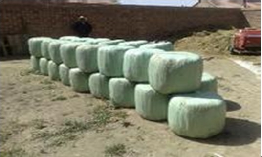 秸稈切短同常規(guī)青貯,將切短的秸稈鋪在厚約20~25厘米,均勻噴灑菌液,壓實后,再鋪20~25厘米秸稈,再噴灑菌液、壓實,在最上面一層均勻灑上食鹽粉,再壓實后蓋上塑料薄膜封口。