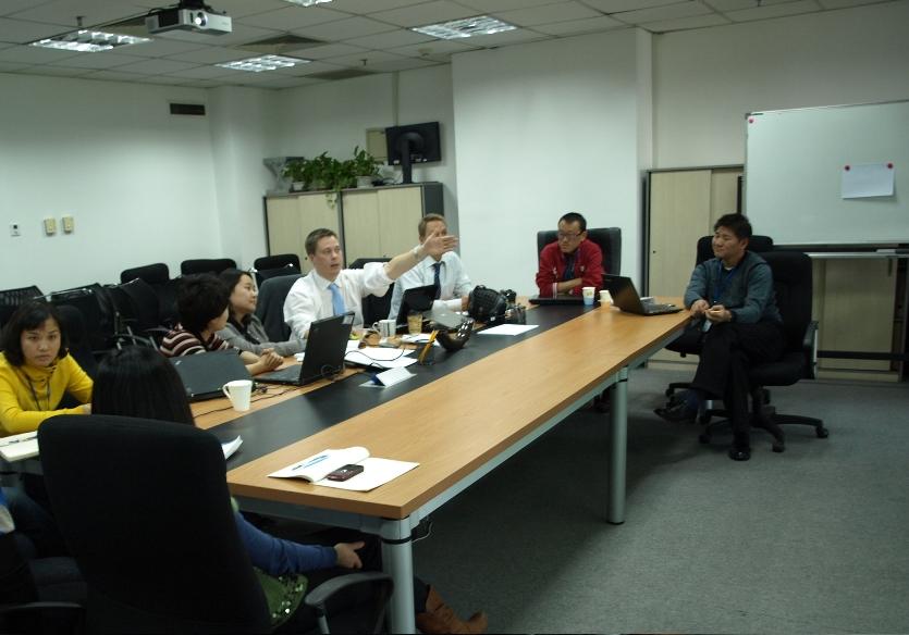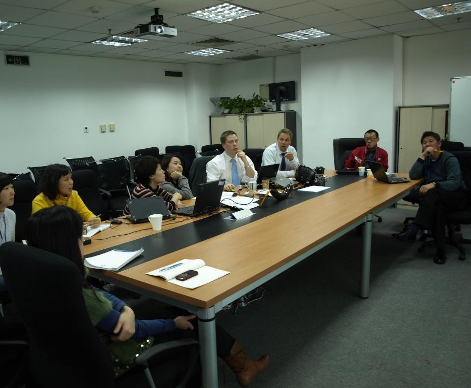 在下午的會(huì)議中,中國(guó)中心的同事通過(guò)教材、課件展示以及平臺(tái)演示,把“上課”、“上班”、“上網(wǎng)”三者循環(huán)及教學(xué)特點(diǎn)做了流程化講解,并回答了芬蘭代表的相關(guān)問(wèn)題,課件與平臺(tái)所涵蓋的內(nèi)容給芬蘭代表留下了非常深刻的印象。在芬蘭中心負(fù)責(zé)合作項(xiàng)目的主管Niko說(shuō):“你們的課程、設(shè)施、服務(wù)和創(chuàng)意都非常好,非常好!”芬蘭代表另一名項(xiàng)目主管Mika也發(fā)出了頻頻的感嘆,在輕松友好的氣氛中,會(huì)議圓滿結(jié)束了。會(huì)后在中國(guó)中心的同事的陪同下芬蘭中心的兩位代表參觀了正保集團(tuán)。