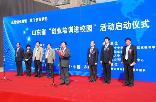 根據(jù)山東省人力資源社會保障廳、教育廳、省工會、團省委、省婦聯(lián)《關于開展創(chuàng)業(yè)培訓進校園活動的通知》(魯人社辦發(fā)「2011」104號通知)的通知要求,為加快畢業(yè)年度高校畢業(yè)生創(chuàng)業(yè)培訓工作的開展,10月14日,由全球模擬公司聯(lián)合體中國中心和山東建筑大學承辦的山東省創(chuàng)業(yè)培訓進校園活動啟動儀式在山東省建筑大學成功舉辦,省政協(xié)副主席齊乃貴出席啟動儀式;儀式由省人力資源和社會保障廳廳長董國勛主持。出席的領導還有省人力資源和社會保障廳副廳長李伯平、省教育廳副廳長宋承祥、省總工會副主席趙立群、共青團山東省委副書記張輝、省婦女聯(lián)合會副主席郭翠芬,以及以及建筑大學校長王崇杰、副校長岳寶德等領導。