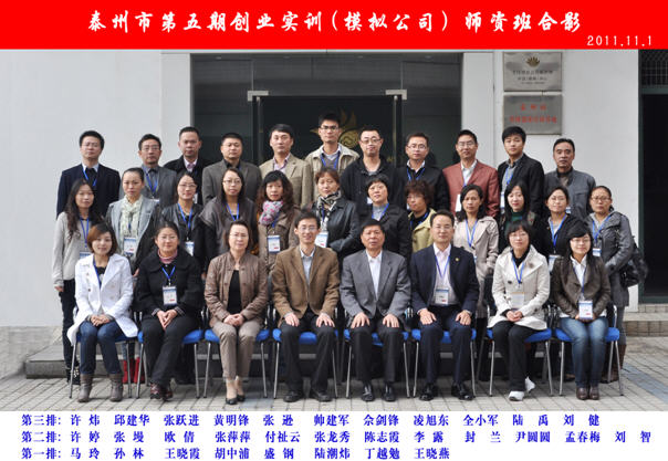 2011年11月1日,泰州市第五期創(chuàng)業(yè)實訓(模擬公司)師資班開班儀式在創(chuàng)業(yè)實訓基地三樓舉行。泰州市人力資源和社會保障局副局長盛鋼、勞動就業(yè)管理中心主任科員王曉霞、國家資深培訓師胡中浦出席了開班儀式。儀式由全球模擬公司聯(lián)合體中國(泰州)中心陸潮煒主持。