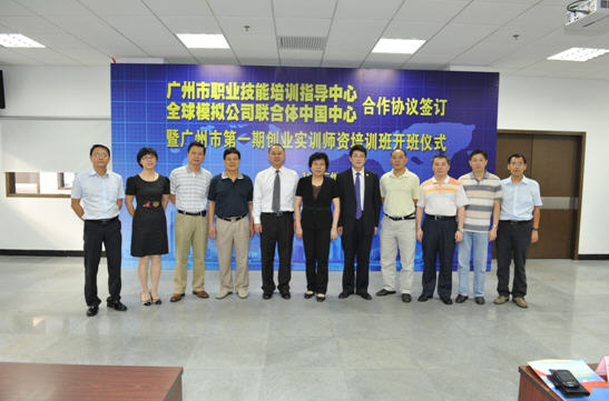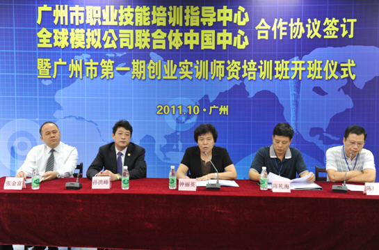 為全面推進(jìn)廣州市創(chuàng)業(yè)帶動(dòng)就業(yè)工作,發(fā)揮創(chuàng)業(yè)帶動(dòng)就業(yè)的倍增效應(yīng),2011年10月18日上午,全球模擬公司聯(lián)合體中國中心與廣州市職業(yè)技能培訓(xùn)指導(dǎo)中心合作簽訂暨廣州市第一期創(chuàng)業(yè)實(shí)訓(xùn)師資培訓(xùn)班開班儀式在廣州市就業(yè)訓(xùn)練中心舉辦。廣州市人力資源和社會(huì)保障局副局長鐘麗英、廣州市就業(yè)訓(xùn)練中心主任陳禮海、副主任陳松光、創(chuàng)業(yè)部部長歐陽振成,正保遠(yuǎn)程教育副總裁、正保育才總經(jīng)理、全球模擬公司聯(lián)合體主任孫洪峰、正保育才市場總監(jiān)張金富參加了啟動(dòng)儀式。