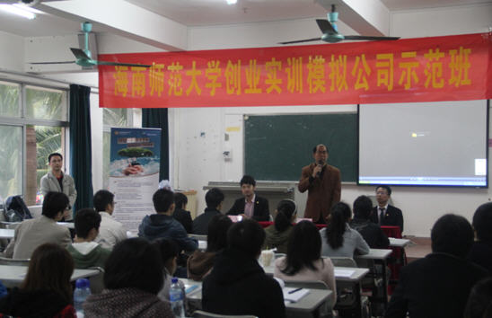 2012年1月9日,??谌肆Y源和社會(huì)保障局和海南師范大學(xué)合作舉辦的首期創(chuàng)業(yè)實(shí)訓(xùn)模擬公司示范班在海南師范大學(xué)開(kāi)班。 近50名同學(xué)分成了6個(gè)小組,成立了千諾物業(yè)有限公司,天運(yùn)大酒店模擬公司,遠(yuǎn)景國(guó)際旅游模擬公司,海南省??谑轩o橋緣婚慶模擬有限公司,萬(wàn)豪汽車(chē)銷(xiāo)售模擬有限公司,柒艾傳媒模擬有限公司。他們?cè)谔摂M的公司里學(xué)習(xí)怎么當(dāng)老板,除沒(méi)有實(shí)體產(chǎn)品外,從簽合同到付款,都和現(xiàn)實(shí)的交易一樣。從如何擬定創(chuàng)業(yè)計(jì)劃書(shū)、創(chuàng)辦企業(yè)、進(jìn)行工商注冊(cè)、稅務(wù)登記等,甚至在企業(yè)運(yùn)營(yíng)中如何降低水電、房租、人力成本等各方面步驟上進(jìn)行指導(dǎo)性的訓(xùn)練。