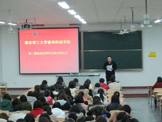 2012年3月20日19時(shí),南京理工大學(xué)泰州學(xué)院第三期創(chuàng)業(yè)實(shí)訓(xùn)培訓(xùn)班開班儀式在多功能報(bào)告廳舉行。南京理工大學(xué)泰州學(xué)院商學(xué)院院長助理徐老師 、泰州市就業(yè)管理中心綜合培訓(xùn)科主任張德榮、全球模擬公司聯(lián)合體中國(泰州)中心主任陸潮煒,6位創(chuàng)業(yè)實(shí)訓(xùn)教師及參加培訓(xùn)班的300名學(xué)員共同出席了開班儀式。開班儀式由南京理工大學(xué)泰州學(xué)院商學(xué)院院長助理徐老師主持。